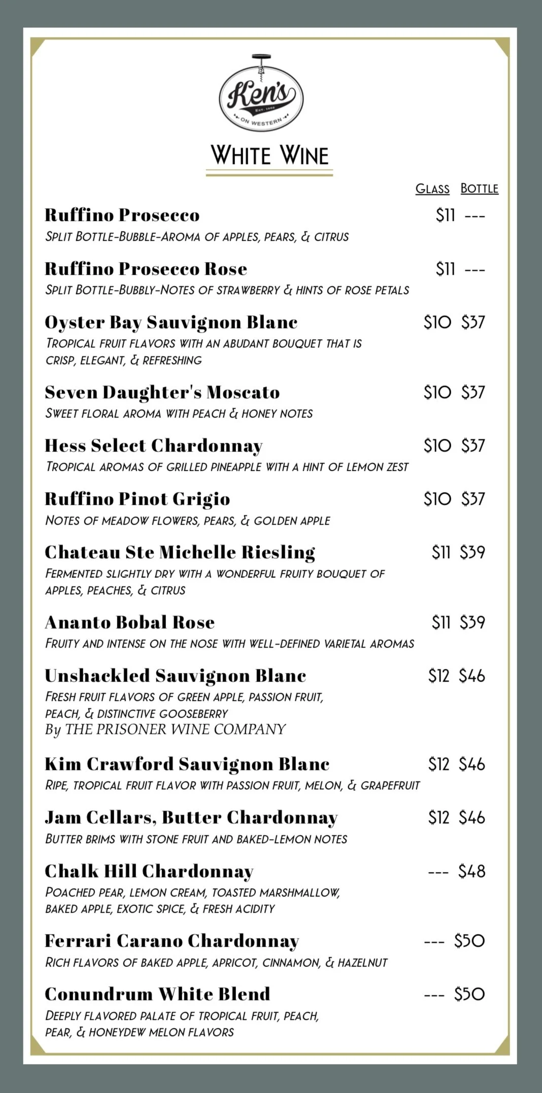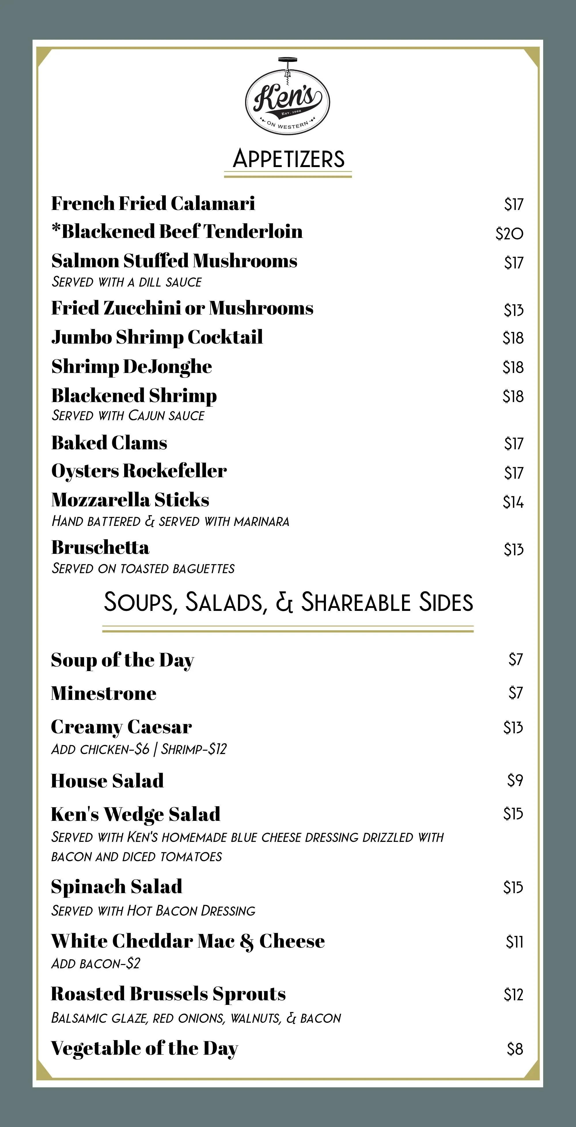 Ken's on Western is about family, tradition, food, libations, classic favorites, great times with close friends. Our formal dining area is open Monday & Tuesday from 4PM-9PM, Tuesday through Saturday from 4PM until 10PM and Sunday's 3PM until 9PM. The bar is open later!